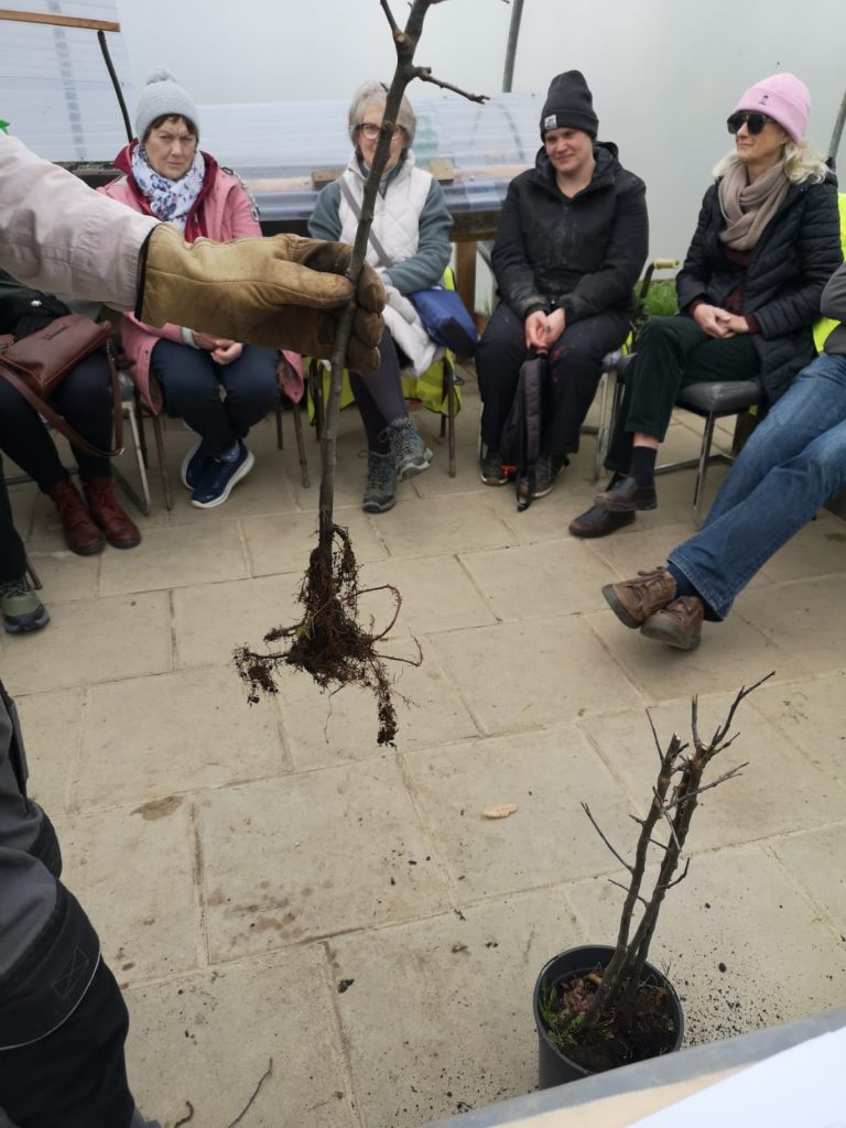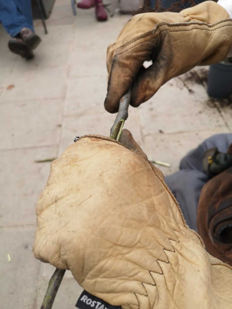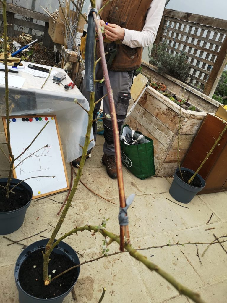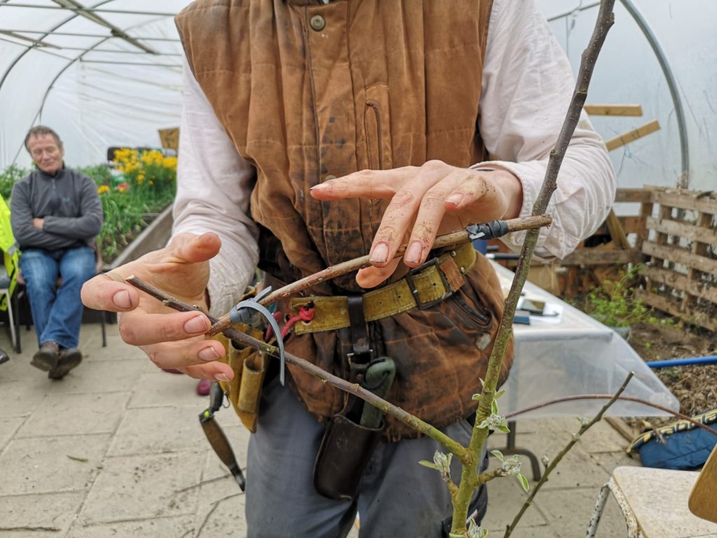 The participants correctly thought that all of this pruning had something to do with the fruit – which is exactly the right track. The fact is that practically every comercially grown apple has been grown on a tree that was grafted. With apple trees, grafting is a procedure that joins two (usually) different varieties of apple together – the top part is called the “scion” and it determines the variety of fruit to be borne, the bottom part is called the “rootstock” and it will have certain desireable characteristics regarding the tree mature size, and disease resistance. This union allows the perpetual cloning of a desirable, once indidual tree variety such as Granny Smith or Cox’s Pippin etc. Otherwise those varieties would have been one-off individual trees, fated to live and die after a time.