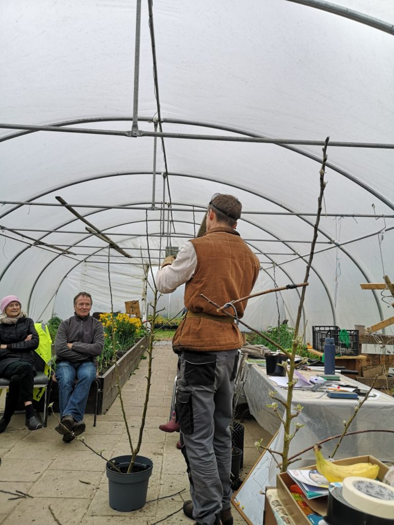 While I was on my second pruning demonstration tree however we got rained back into the tunnel. I had plenty material prepared for just such a situation and so demonstrated on potted trees and did some demonstration grafting, using scion wood from the IRD Duhallow orchard and a rootstock that I had brought with me. We potted the tree there and then to add to the orchard in a couple of years time when it is ready to plant out.